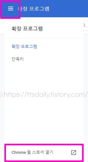 확장 프로그램 페이지 좌측 상단의 [목록 아이콘]을 클릭한 후, 하단의 [Chrome 웹 스토어 열기]를 클릭합니다.