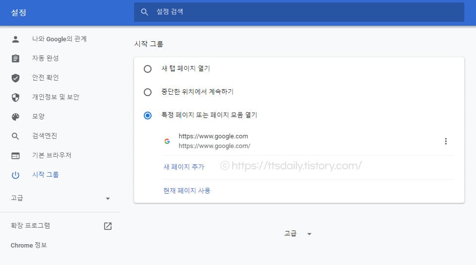 분명 크롬 브라우저 새 탭을 내 마음대로 설정할 수 있지 않을까 싶어 설정 페이지 [시작 그룹]에서 [특정 페이지 또는 페이지 모음 열기]로 구글 닷컴을 추가해 보았지만 적용되지 않았습니다.