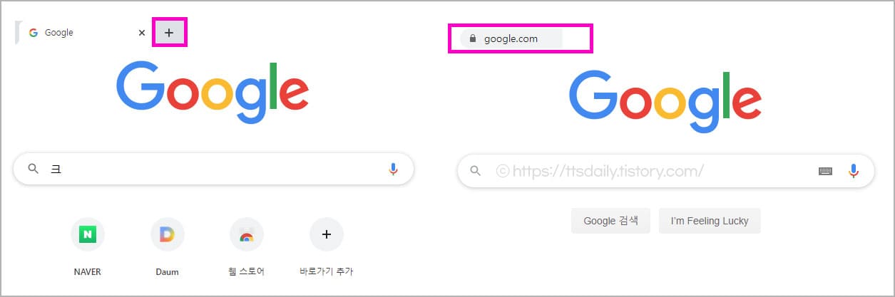 이미지 왼쪽은 원래 크롬 브라우저에서 새탭을 누르면 나오던 구글 화면입니다. 아래 바로가기 버튼이 있어서 편리하게 사용할 수 있습니다.