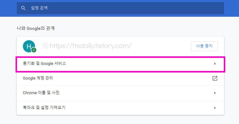 설정 페이지에서 [동기화 및 google 서비스]를 클릭합니다.