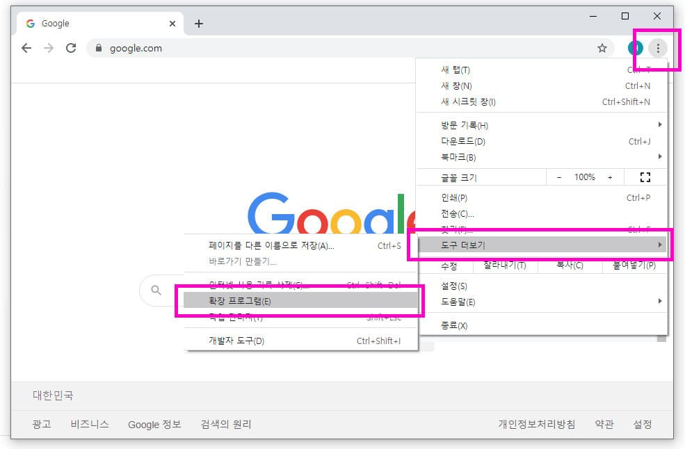 다시 크롬 브라우저 상단의 점 세 개를 눌러 [도구 더보기] - [확장 프로그램]을 클릭합니다.