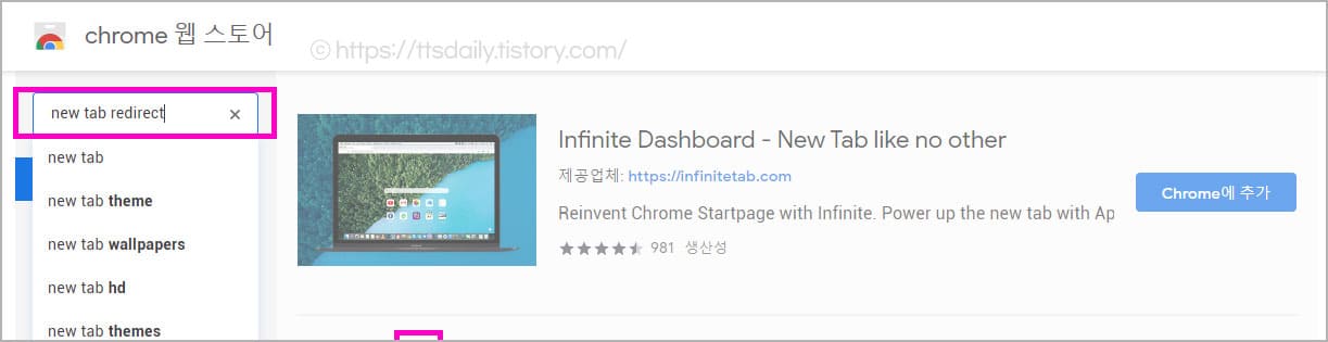 크롬 웹스토어의 검색창에서 'new tab redirect'를 검색합니다.