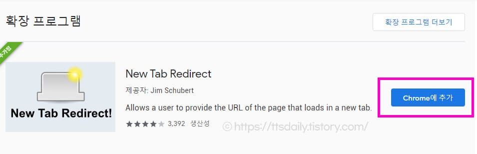 검색된 페이지에서 New tab redirect의 [Chrome에 추가] 버튼을 클릭해 확장 프로그램을 설치합니다.