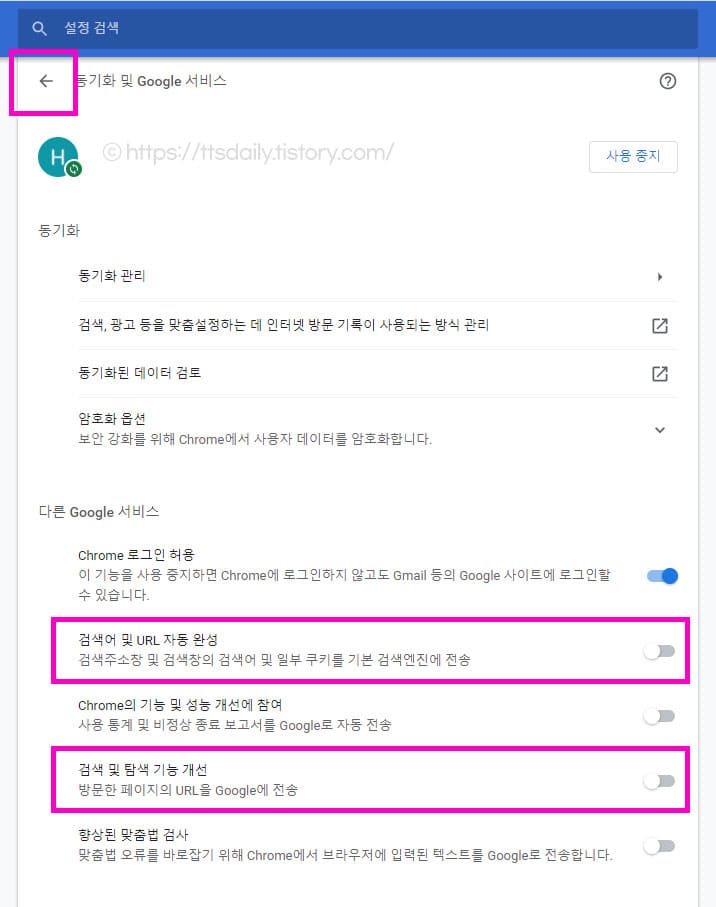 다른 google 서비스 영역의 [검색어 및 URL 자동완성]과 [검색 및 탐색 기능 개선] 토글 버튼을 눌러 기능을 OFF 시킵니다. 기능이 꺼지면 이미지처럼 회색 버튼으로 변합니다.