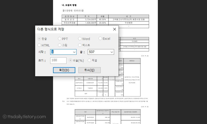 여기서 시작 페이지와 끝 페이지를 선택할 수 있어서 2페이지까지만 선택을 했지만, 막상 한글파일로 저장된 결과물을 보니 모든 페이지가 다 변환된 것을 볼 수 있었습니다.