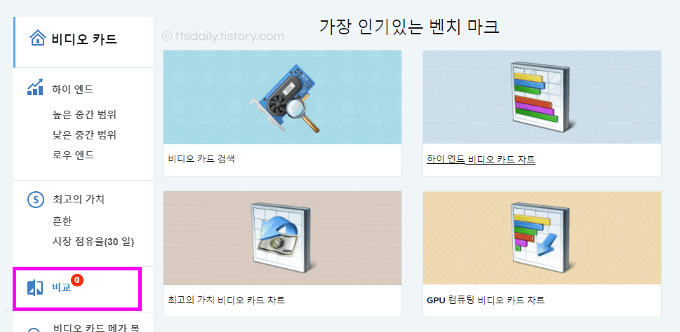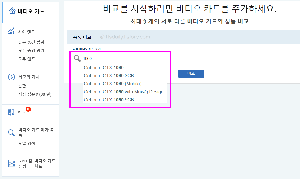 그래픽 카드 성능 비교를 위해 최대 3개까지 서로 다른 그래픽 카드를 검색해서 비교할 수 있습니다.