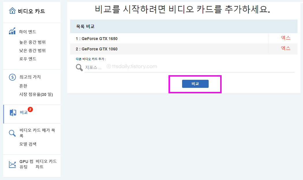 2개를 비교하고 싶다면, 두 번 검색하여 그래픽 카드 제품을 추가하시면 됩니다.