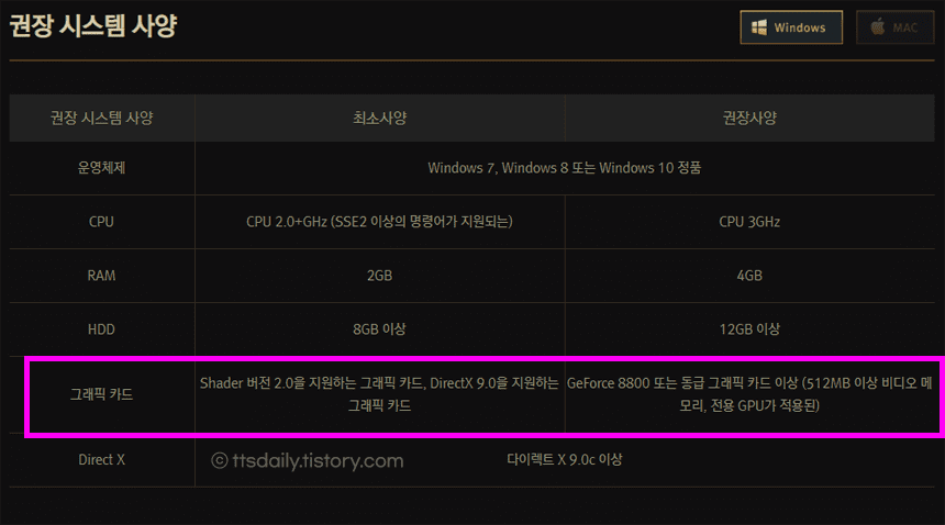 롤(lol)을 원활하게 플레이하기 위해서 권장하는 그래픽 카드 최소사양은 shader버전 2.0과 DirectX 9.0을 지원하는 그래픽 카드입니다. 이것은 말 그대로 최소일 뿐 리그 오브 레전드 그래픽 카드 권장사양은 지포스 8800이나 동급 그래픽 카드입니다.